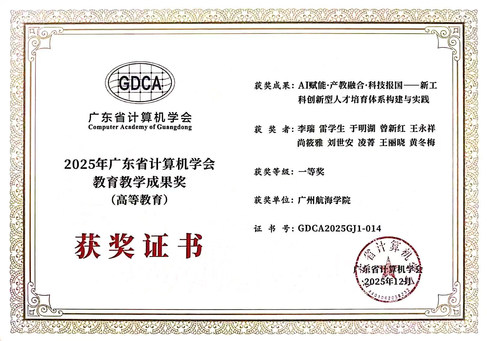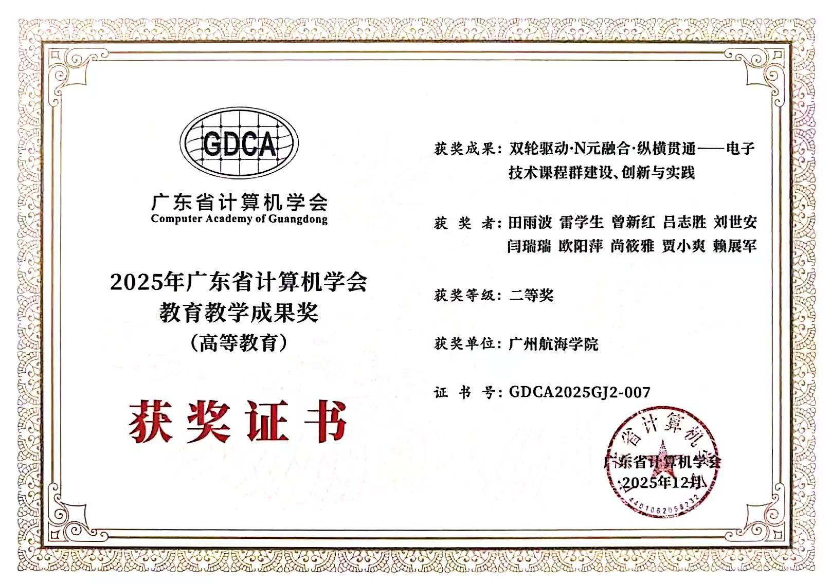 1月10日至11日,“广东省计算机学会&CCF广州分部2025学术年会暨计算机教育与科技创新论坛”在江门举行。我院副院长雷学生、于明湖带队参加了会议。会议开设了“大数据与人工智能论坛、区块链与人工智能协同驱动大湾区数字经济创新发展论坛、低空智联.AI领航——低空经济与人工智能融合创新论坛”等5个学术论坛,同时,举行了“2025年度广东省计算机学会科学技术奖、教育教学成果奖”等奖项的颁奖活动。我院于明湖团队与TCL瑞智(惠州)制冷设备有限公司、西安交通大学、宁夏大学、瑞智(九江)精密机电有限公司联合申报的“小型压缩机静音高效协同优化的智能数字模型及应用”荣获科学技术奖一等奖,田雨波团队与京信通信技术(广州)有限公司联合申报的“雷达空海通感一体化智能监控关键技术创新与应用”荣获科学技术奖二等奖;李瑞团队申报的“AI赋能.产教融合.科技报国新工科创新型人才培育体系构建与实践”荣获教育教学成果奖一等奖,田雨波团队申报的“双轮驱动.N元融合.纵横贯通电子技术课程群建设、创新与实践”荣获教育教学成果奖二等奖。
